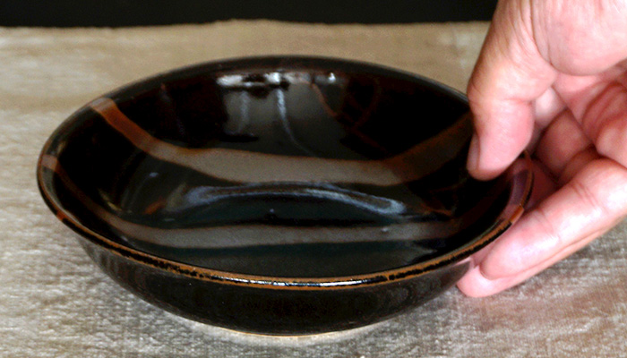 黒地の釉薬の上に三筋流し掛けしました。