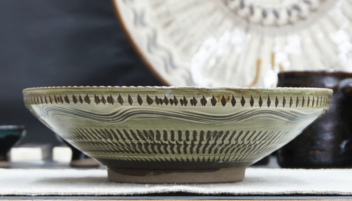 小鹿田焼 浅 大鉢 21cm 飛び鉋外櫛目 緑