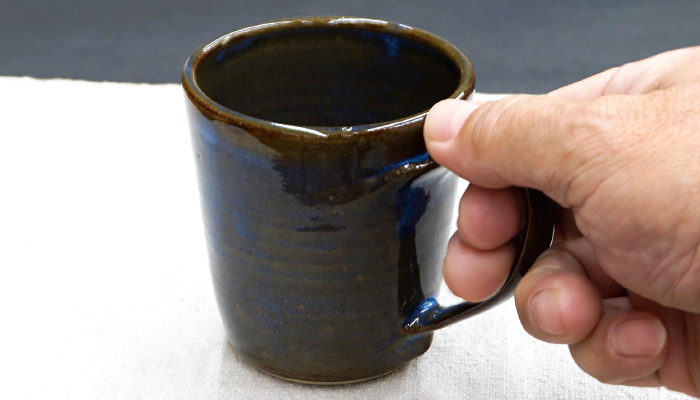うぐいす茶と青の交錯した、渋いマグカップ。